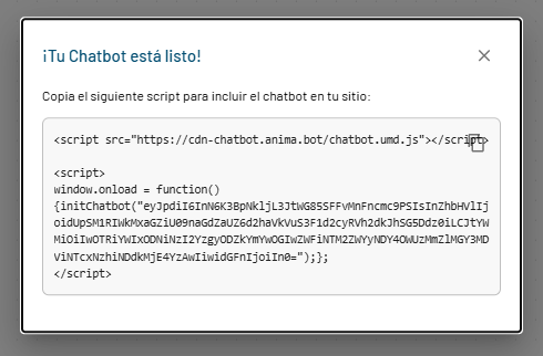 Cuando terminás de diseñar tu chatbot y hacés clic en Guardar y Publicar, Ánima Bot muestra automáticamente una ventana emergente con el código listo para incrustar en tu sitio web.